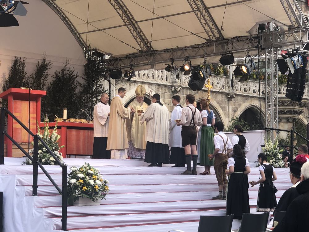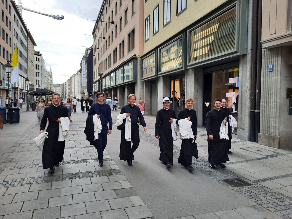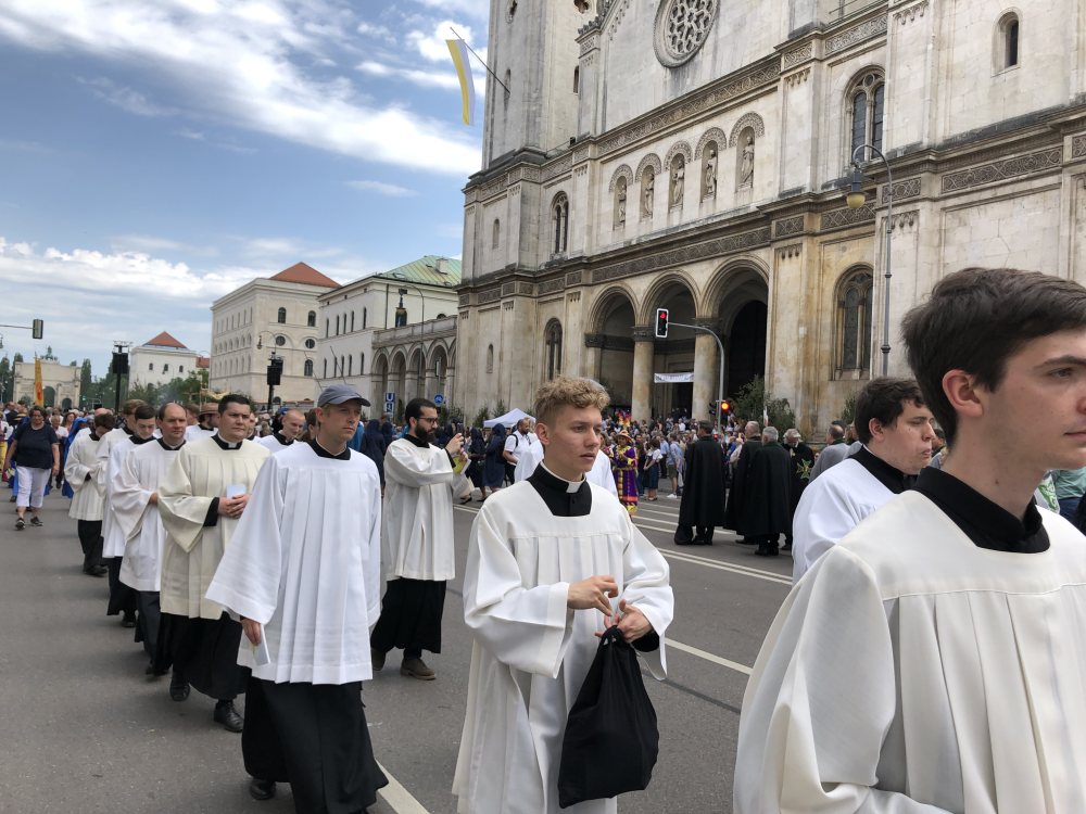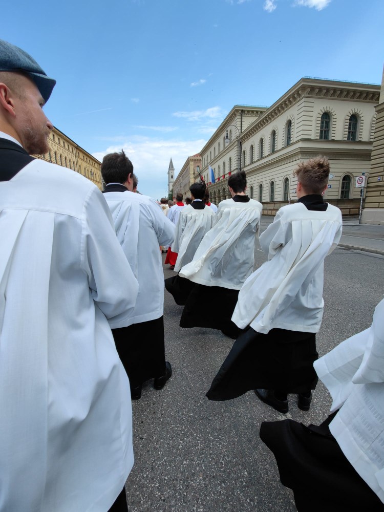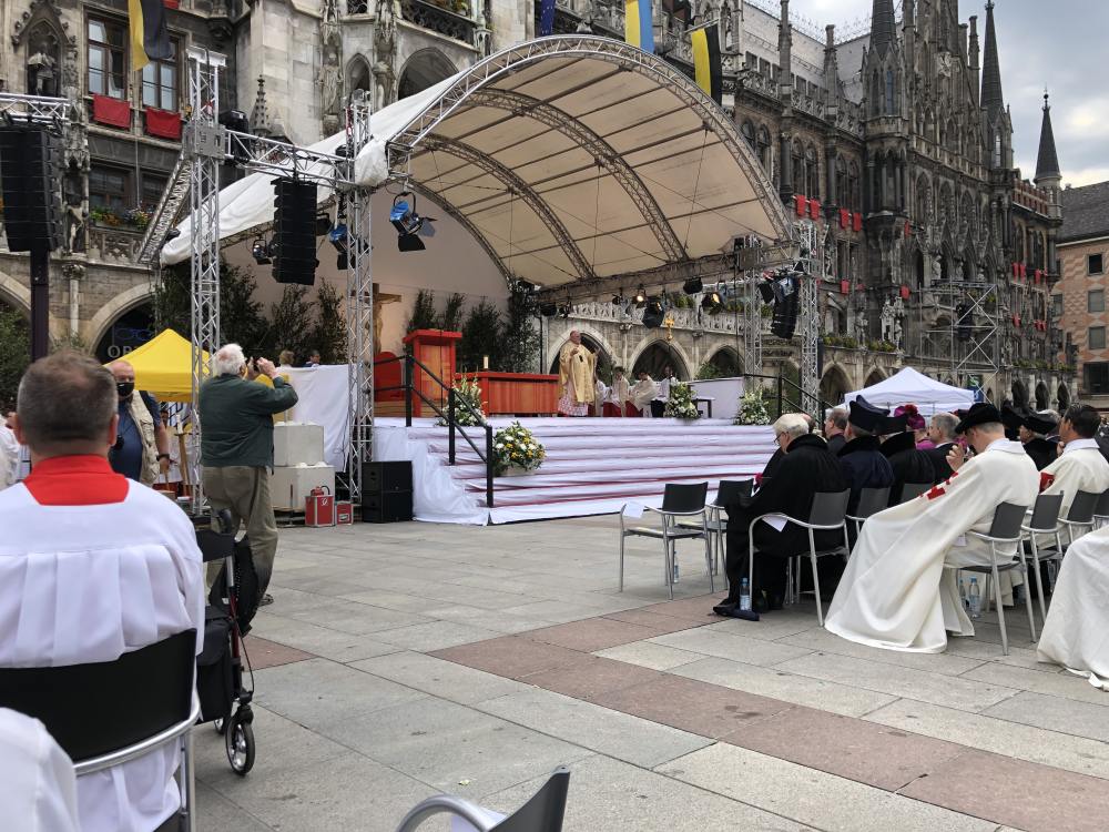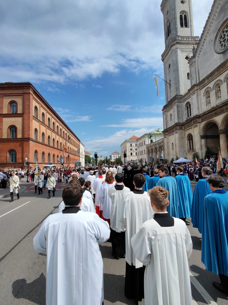 Stand Fronleichnam die letzten beiden Jahre im Zeichen der Pandemie, so stellte Kardinal Marx in seiner diesjährigen Predigt den Ukrainekrieg ins Zentrum der Prozession. Inmitten aller Gewalt eröffne die Eucharistie einen Blick auf Gott, der sich in das Elend hineinbegebe – und werde so zu Bekenntnis, Auftrag und Sendung.
