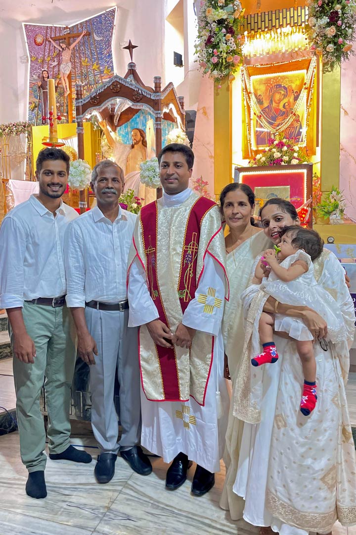 Die Diakonweihe fand nachmittags in der St. Francis Assisi Cathedral in Ernakulam im Beisein von Erzbischof Dr. Joseph Kalathiparambil durch Handauflegung von Weihbischof Dr. Antony Valungal statt. Über diesen wichtigen Schritt auf seinem Weg zum Priestertum freuten sich mit Alphin Chakkungal George auch seine Eltern, sein Bruder, seine Schwägerin und seine kleine Nichte. Nur drei Tage nach dem Tod von Papst Franziskus gab es für die Neudiakone außer der Liturgie keine große Feier.